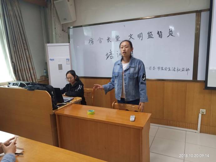 会议伊始,生活部部长孟依冉安排了近期的查宿查寝工作,动员大家共建文明宿舍,更好地迎接本科教学审核评估。她从提升宿舍环境质量的重要性出发,结合以往查宿经验,对宿舍可能出现的安全隐患和卫生问题逐一进行分析解释,并举例说明了文明星级宿舍的好做法,要求宿舍长发挥好带头作用,带领舍友共建优美、安全的宿舍环境。之后她还对文明监督员进行了培训,要求文明监督员以服务员工为准则,认真对待检查宿舍的工作,做到严格要求、细心交流、排查安全隐患,切实把公司打造优秀特色宿舍的要求落到实处。