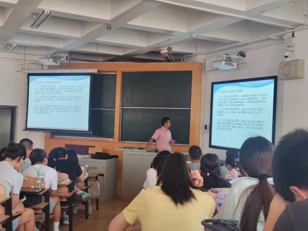 随后,本科师范生实习工作负责人王栋老师进行实习岗前培训工作,王栋老师首先给同学介绍实习的工作性质和要求,然后就实习期间的工作事项和实习需要准备的材料和实习材料的填写进行了讲解。最后,王栋老师就实习工作进行安全教育,就谨防虚假求职信息和传销组织的求职安全、交通安全、网络安全、求职信息安全、人身安全、财产安全和禁毒安全对在场同学开展专题教育。