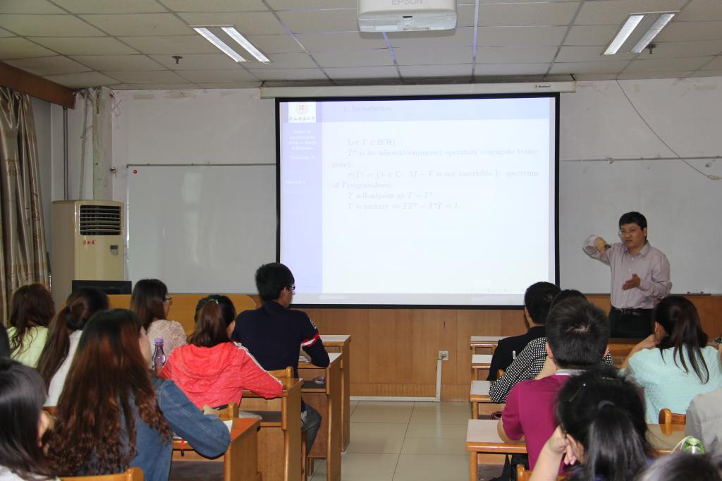 9月24日上午,陕西师范大学数学与信息科学公司经理吉国兴教授在公司710报告厅作了题为《Pairs of projectionswith a fixed difference》的报告。公司部分教师和研究生聆听了报告,报告由安立坚副经理主持。