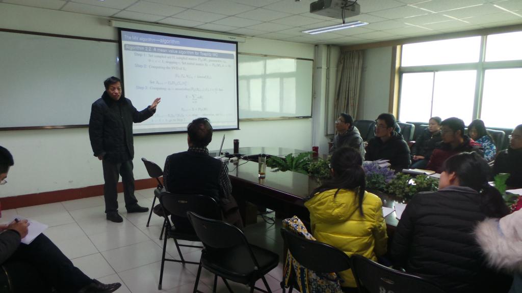 2016年1月2日,在EMC易倍科学会堂A座802会议室,山西太原师范公司的王川龙教授做了题为New Algorithms for Toeplitz Matrix Reconstruction的学术报告。在当天的学术报告上,王川龙先从矩阵填充(Matrix)方面介绍了问题的研究思路,即转化为凸优化问题,解决唯一解。并介绍了FPCA、APG、SVT、ALM(lagrange乘子算法)等凸优化算法。其次从矩阵恢复(recover)方面进行了介绍,结合应用实例,比较了保结构算法和平均值算法等研究方法的优缺点。